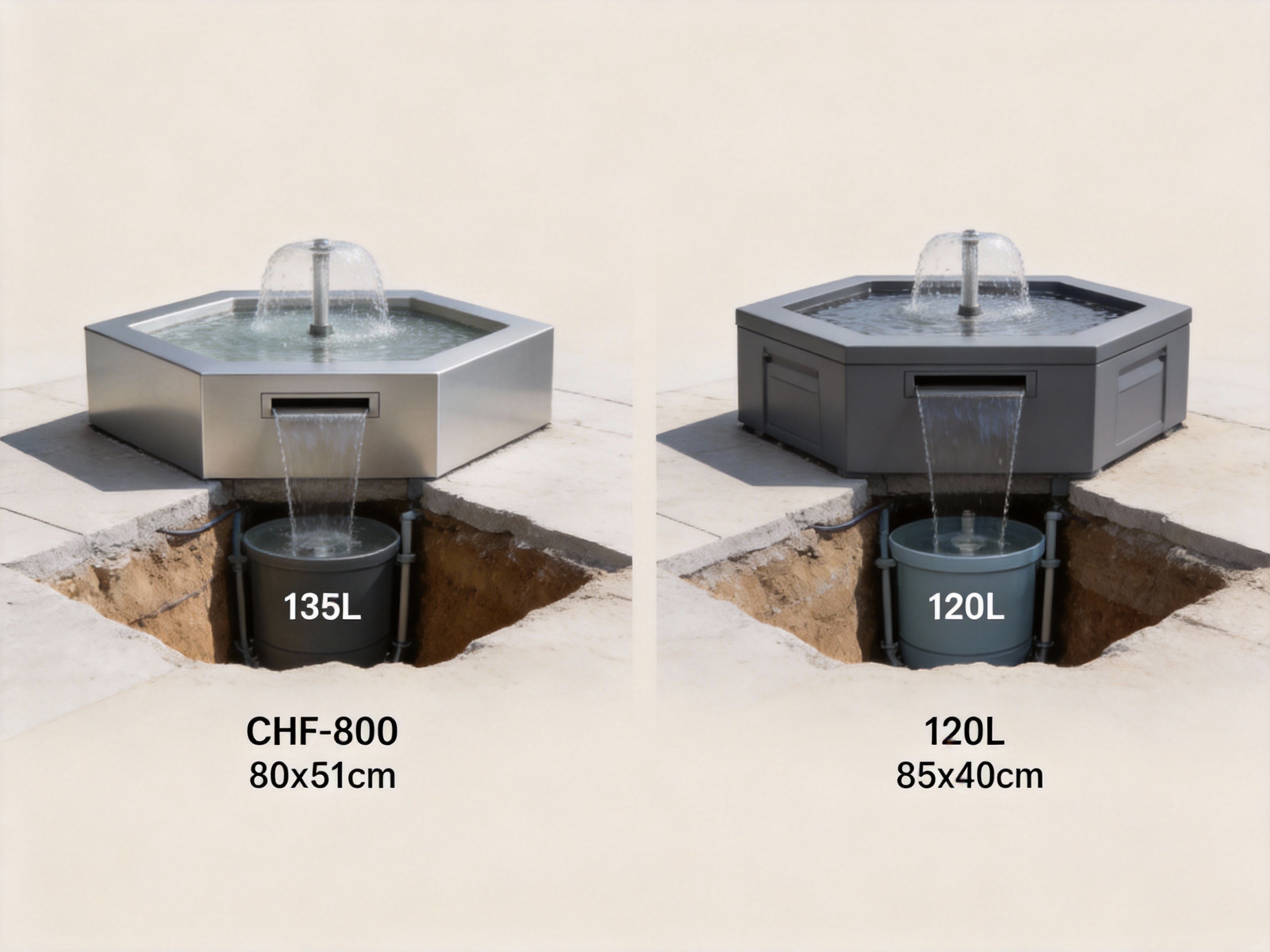 A2: The CHF-640 is ideal for small residential patios or balcony gardens, with a compact size and 50L cubage. The CHF-600 is perfect for medium-sized gardens or small commercial courtyards, with a 60L cubage. The CHF-800 is designed for large residential yards or public spaces, with a 135L cubage and robust water flow.