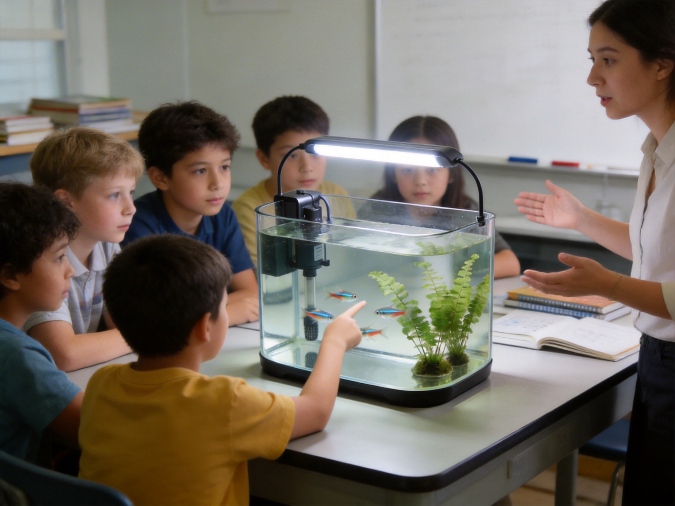 A7: Yes. The adjustable LED lighting provides enough light for most low-to-medium light aquatic plants (like Java Fern, Anubias, or Moss). The built-in filtration system also helps maintain water quality, which is essential for live plant growth.