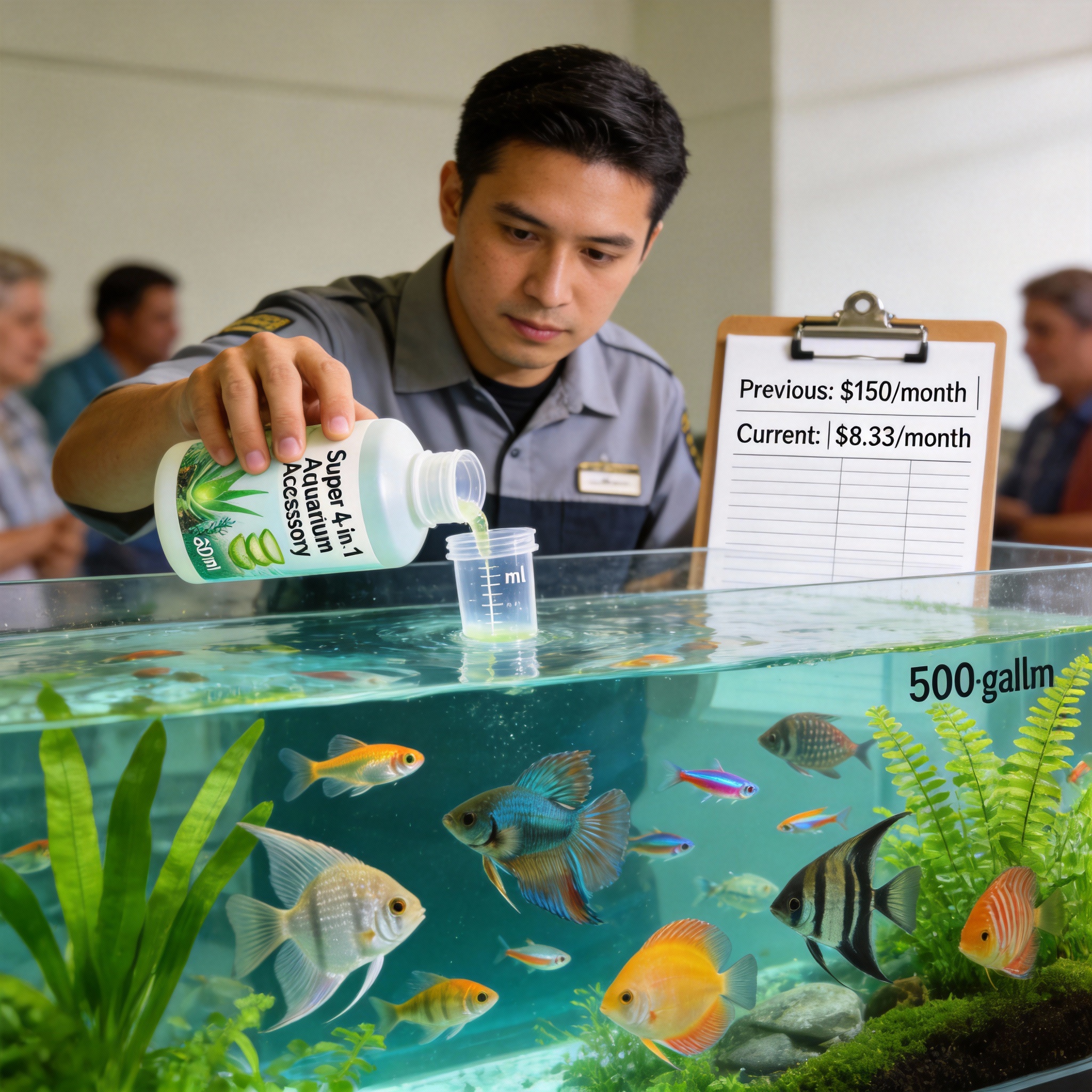 Mike is the owner of a 500-gallon commercial aquarium in a local mall, which houses 200 tropical fish (including angelfish, discus, and tetras) and 50 live plants (including Amazon swords, Java ferns, and water lilies). He previously spent $150 per month on four separate products (a water conditioner, an algae inhibitor, a stress reliever, and a nutrient supplement) and 30 minutes per week applying them. He was also struggling with high maintenance costs—his monthly water change bill was $200, and he had to replace 10% of his fish every month due to stress-related illnesses.