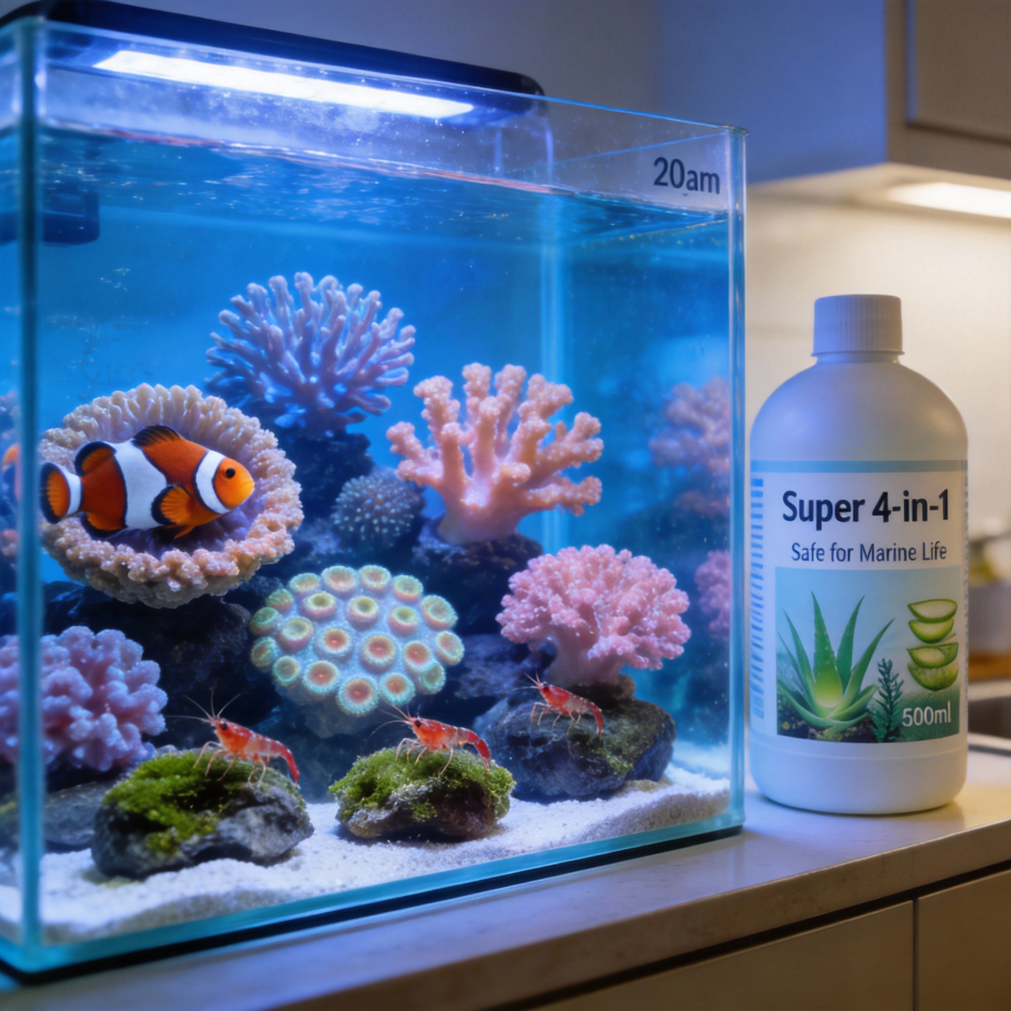Li is a 45-year-old marine aquarist who has a 20-gallon reef tank with 2 clownfish, 10 zoanthid corals, 5 LPS corals, and 3 cherry shrimp. He has been keeping marine tanks for 15 years and is very cautious about the products he uses—many multi-functional products contain ingredients that harm corals or shrimp. However, after reading that the Super 4-in-1 was tested with marine life, he decided to give it a try.